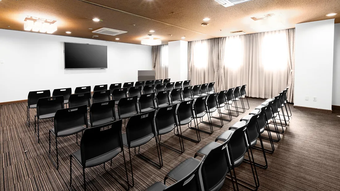 学校の教室と同じスタイルで、全ての席が前方に向いたレイアウトです。セミナー・研修・勉強会での利用が多く、PCや資料を広げての受講も快適です。